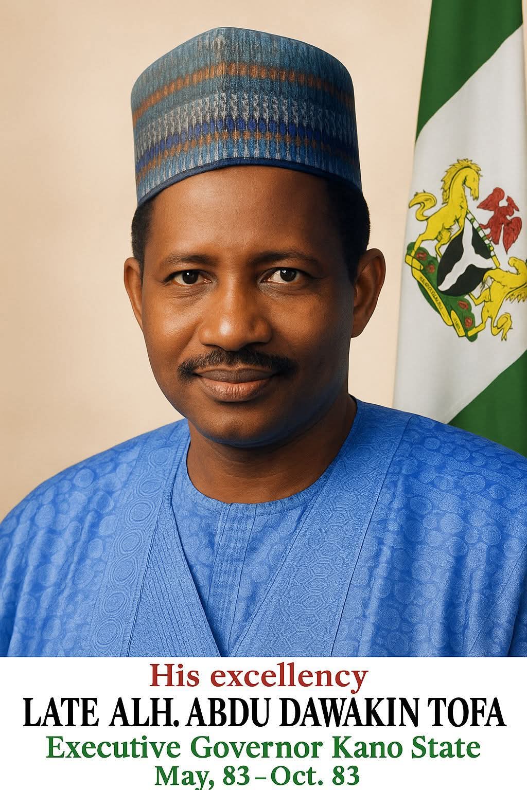 “Allah Ya jikansa! LATE ALH. ABDU DAWAKIN TOFA – Gwamnan Kano na ɗan lokaci amma mai tarihin mutunci da rikon amana. Daga Mayu zuwa Oktoba, 1983 ya jagoranci jihar Kano da natsuwa da kishin kasa. Tarihinsa ya zauna da ɗimbin darussa ga wannan zamani.”_