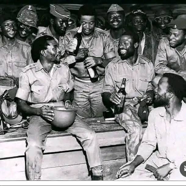 This photograph, taken during the Nigerian Civil War (1967–1970), captures Colonel Benjamin Adekunle, popularly known as “The Black Scorpion,” standing at the far left. With him are Sunny Tuoyo, Godwin Ally, Yemi Alabi, Kunle Elegbede, and Alimi Ogunkanmi. The picture was taken in May 1968 in Port Harcourt, shortly after the city was captured from retreating Biafran forces.